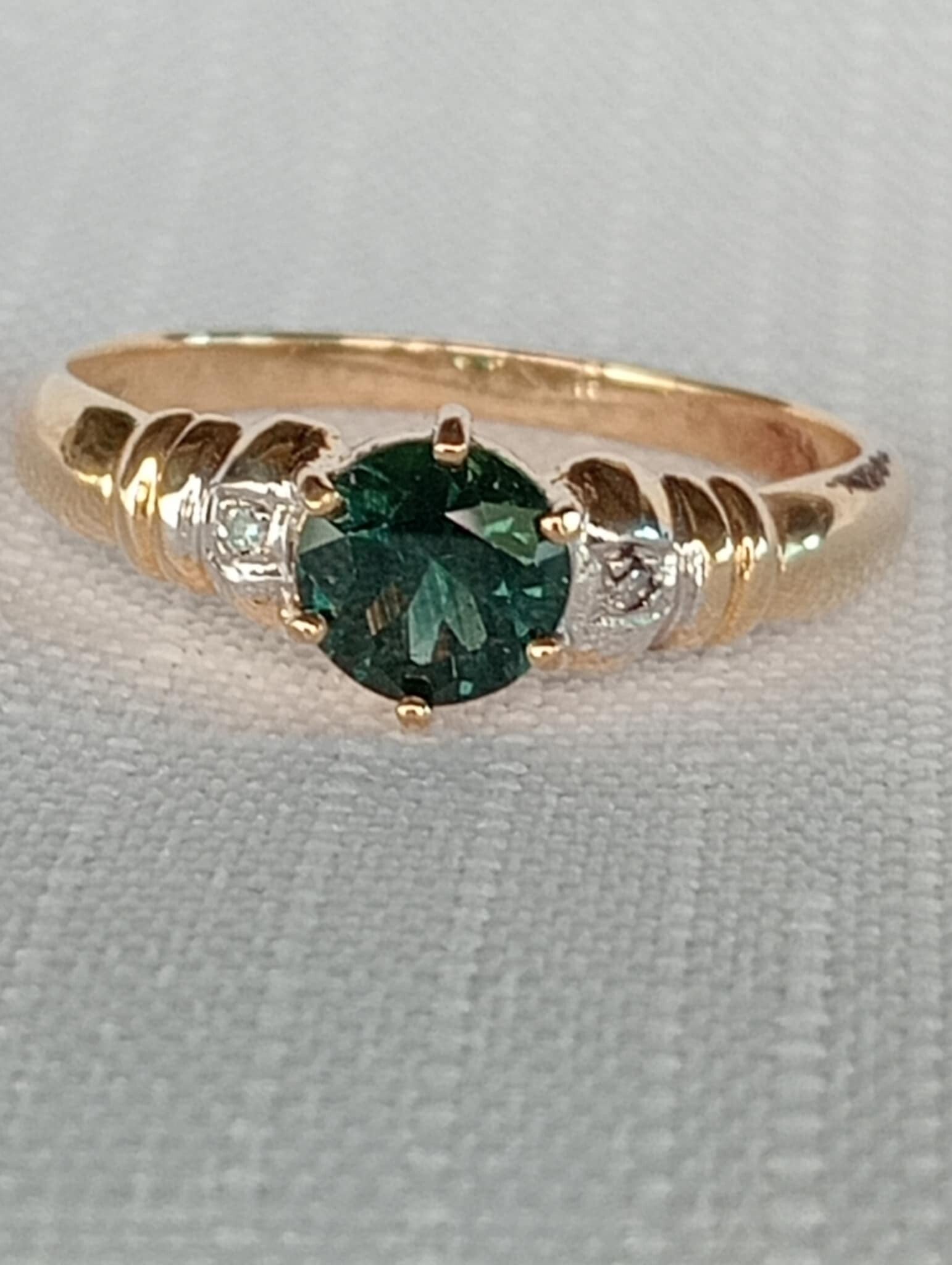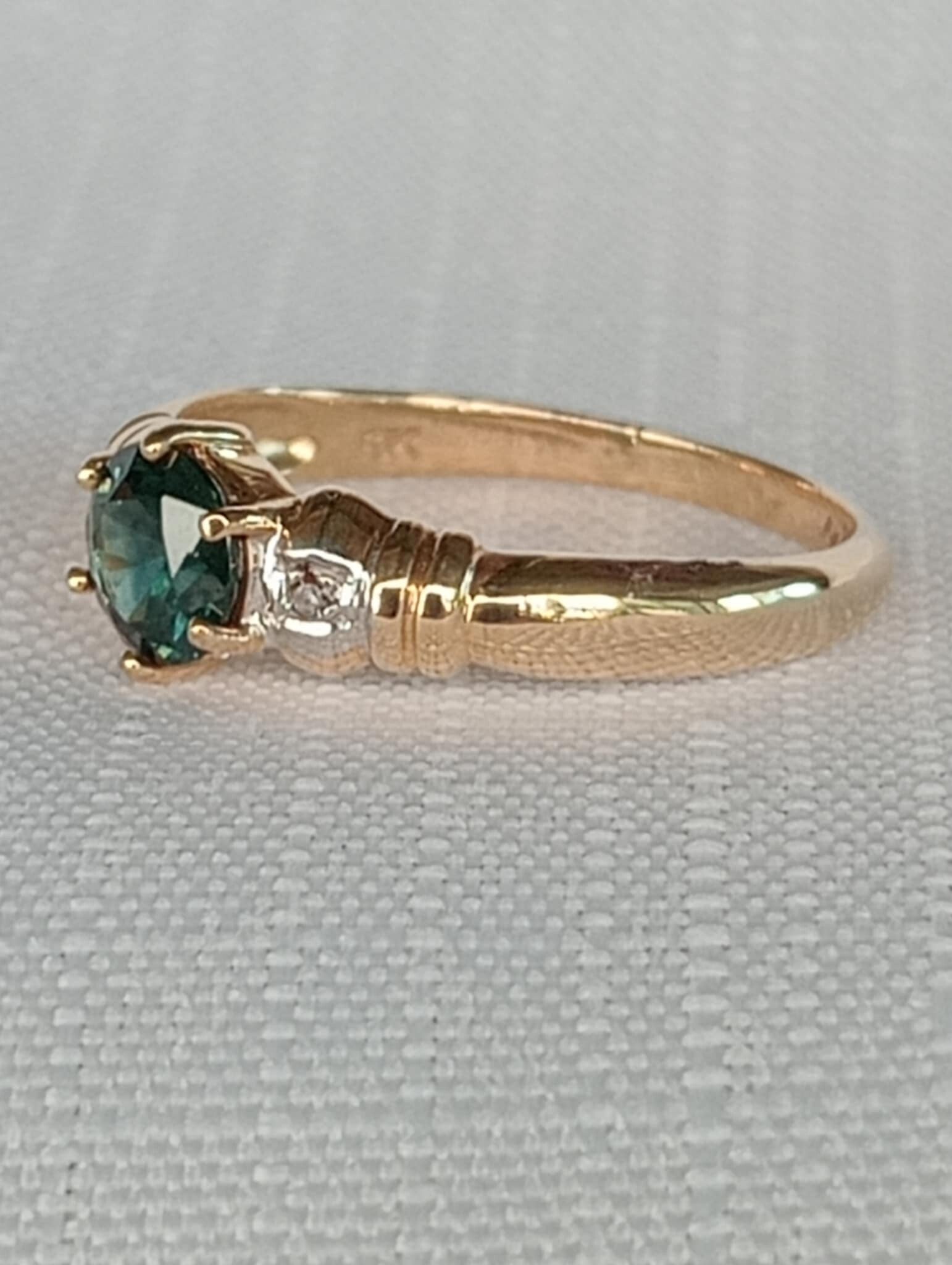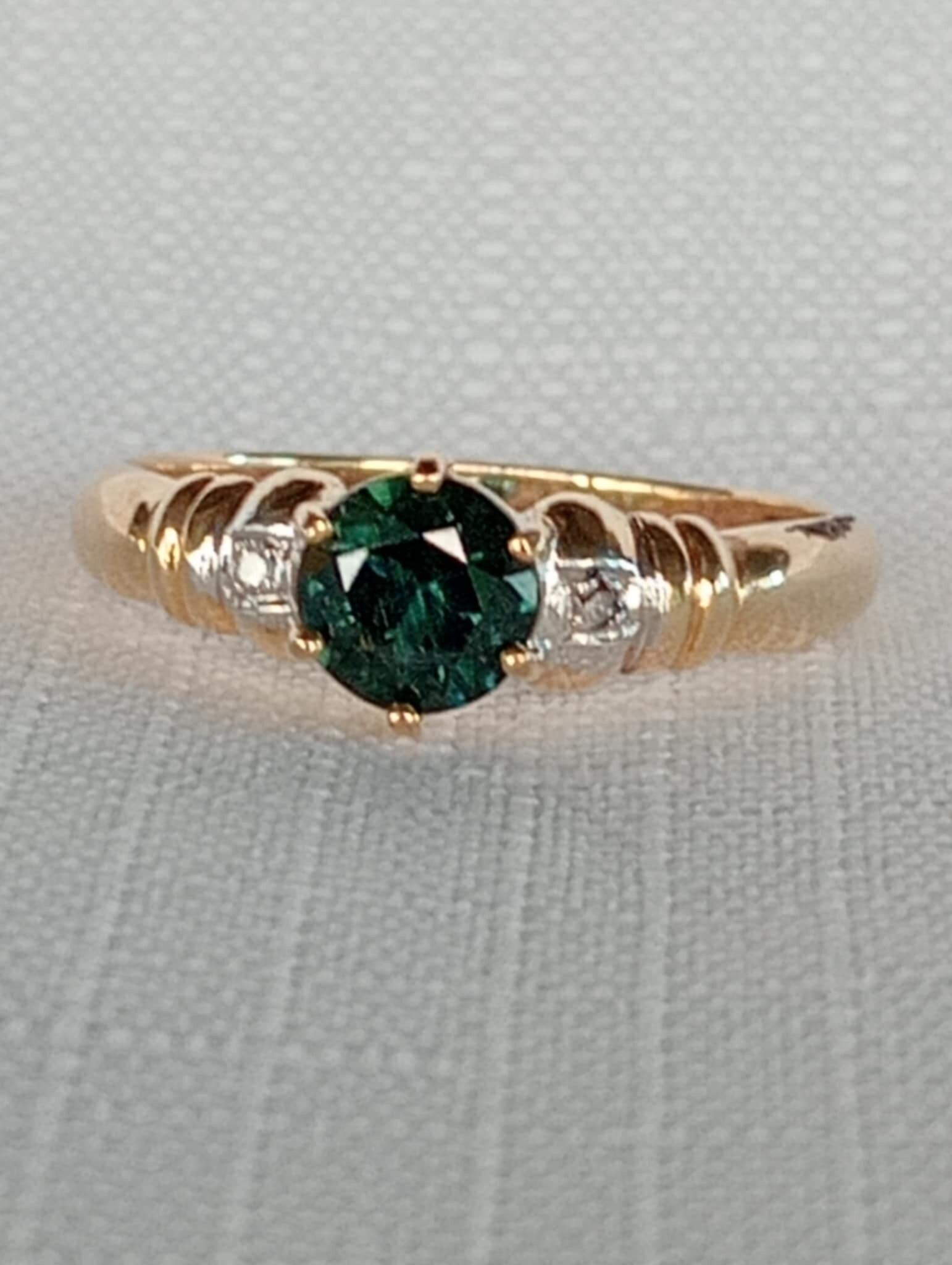 1ct 6mm dark green brilliant cut sapphire, two 1.5mm brilliant cut diamonds set in 9ct gold. wide at base with graduating shoulders which join the white gold plate on the shoulders. Size R Can be resized by your local jeweller