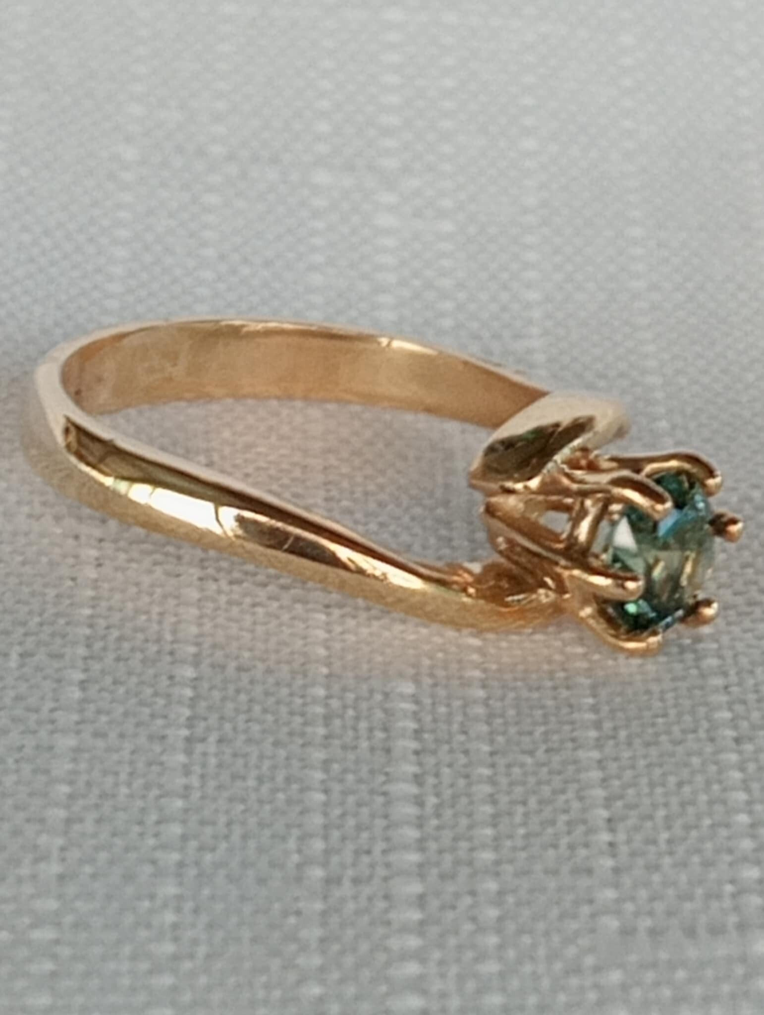 .66ct 5.2mm mid green brilliant cut sapphire, eye clean, set in 9ct gold wide base with flow up wrap around shoulders that join in the six claw coronet in which sapphire is mounted. Size k1/2.