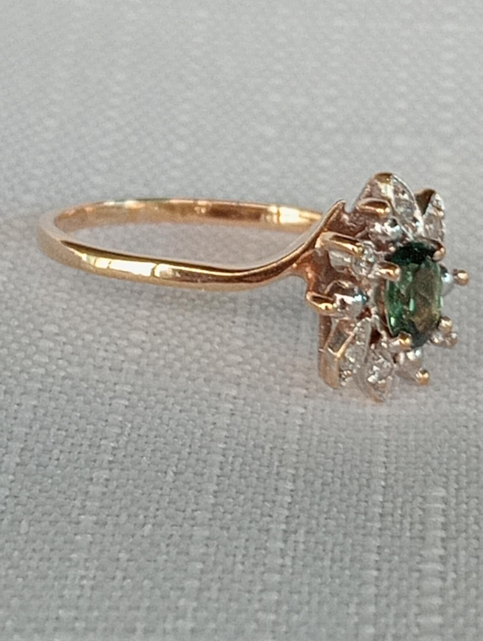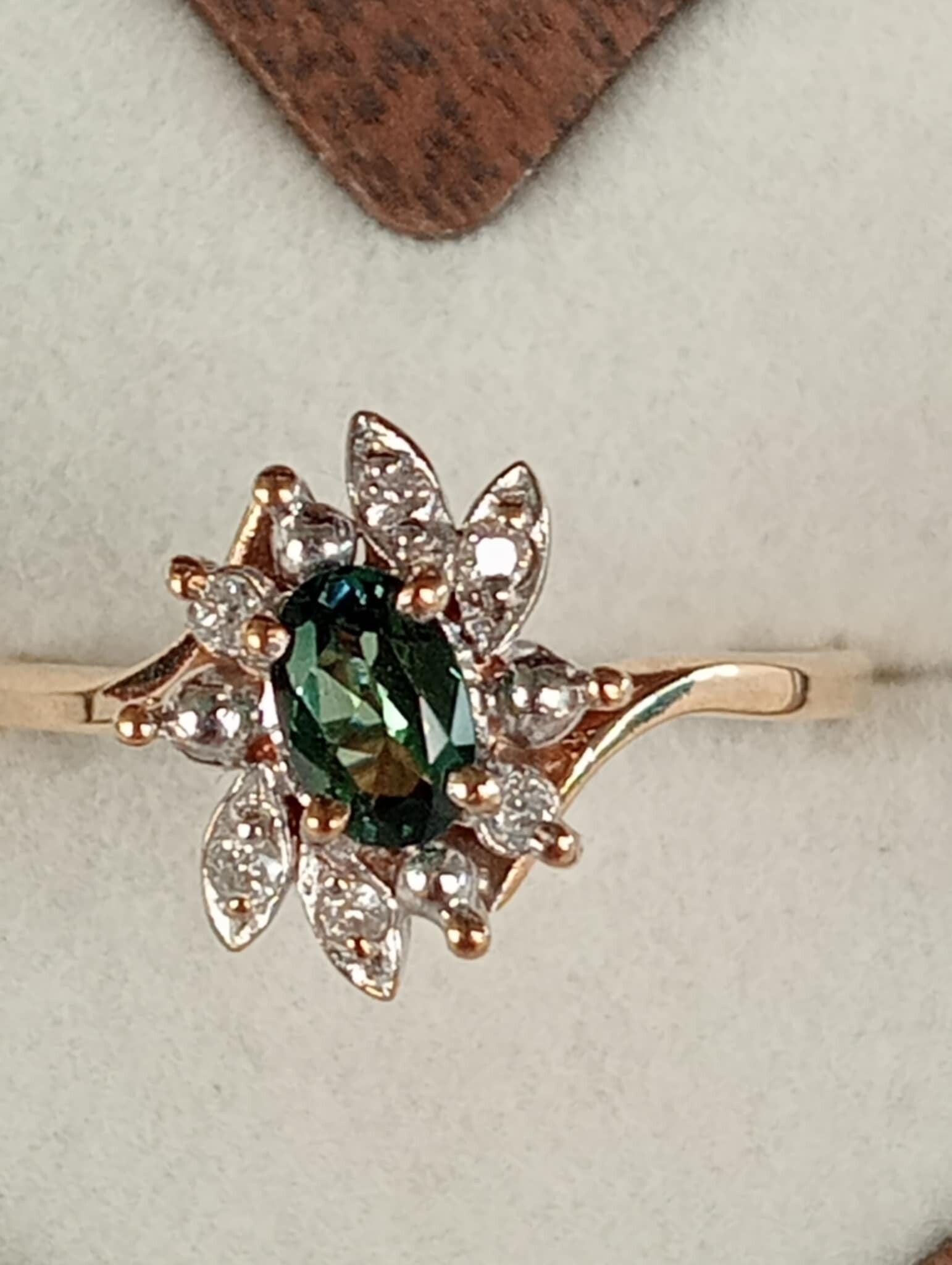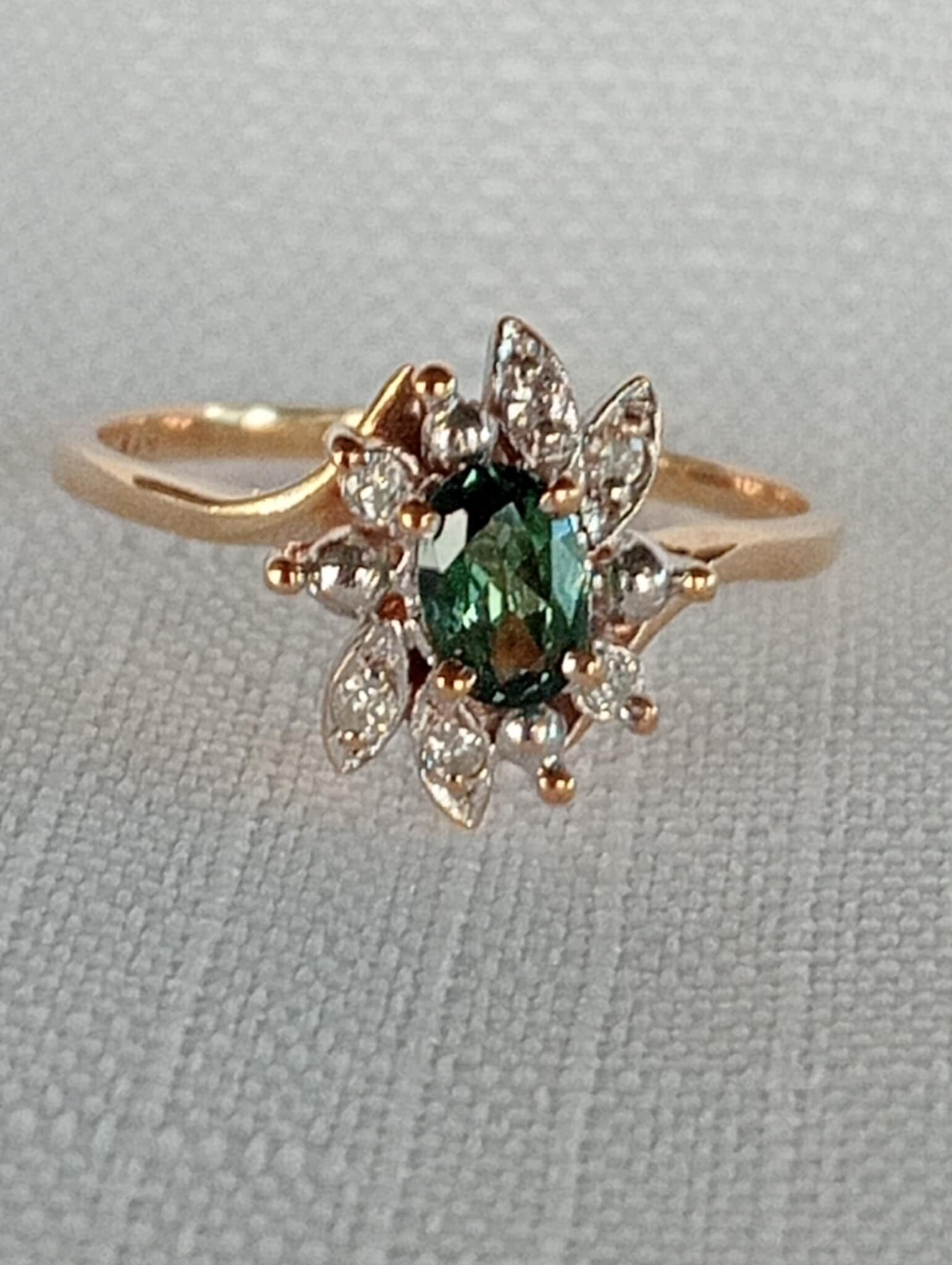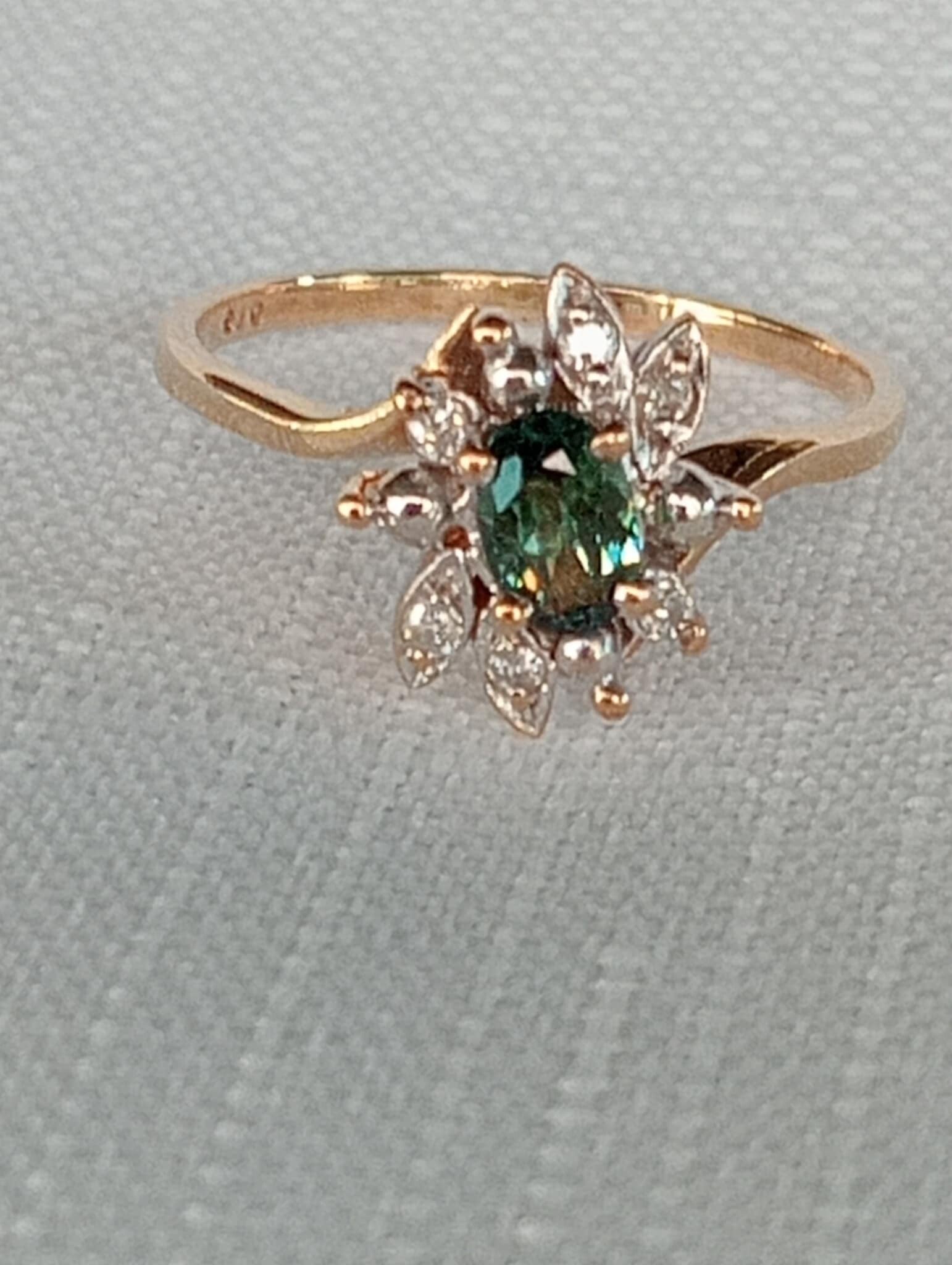 .40ct green/blue set in 9ct gold surrounded by six brilliant cut diamonds mounted in white gold plate leaf shapes.