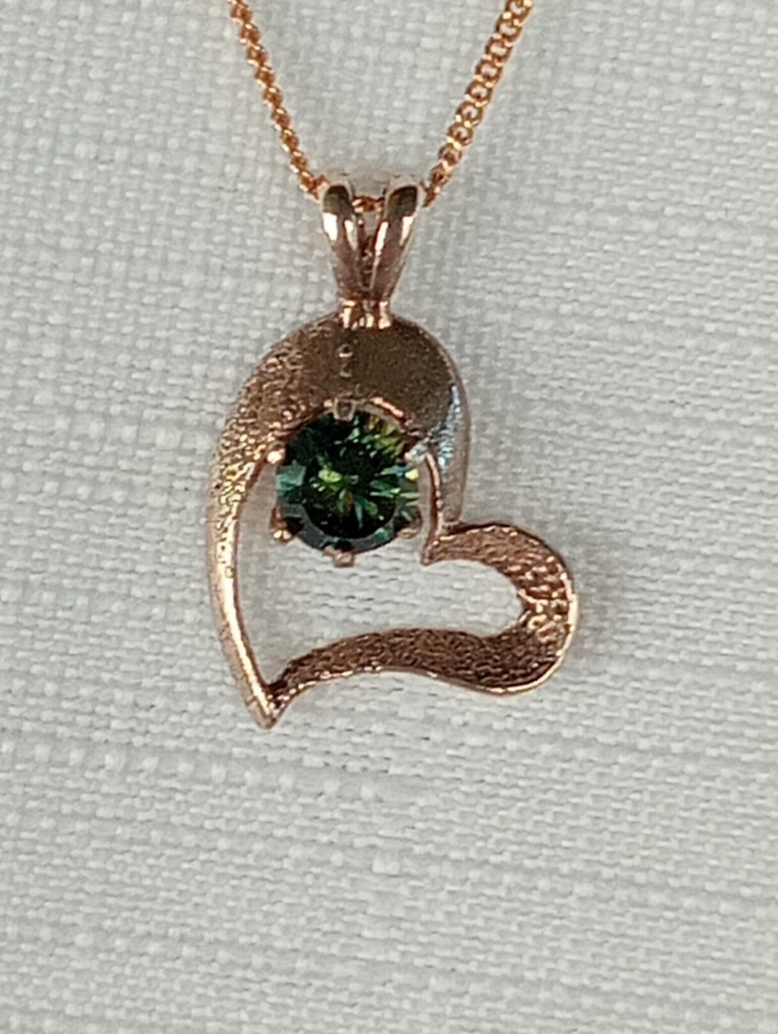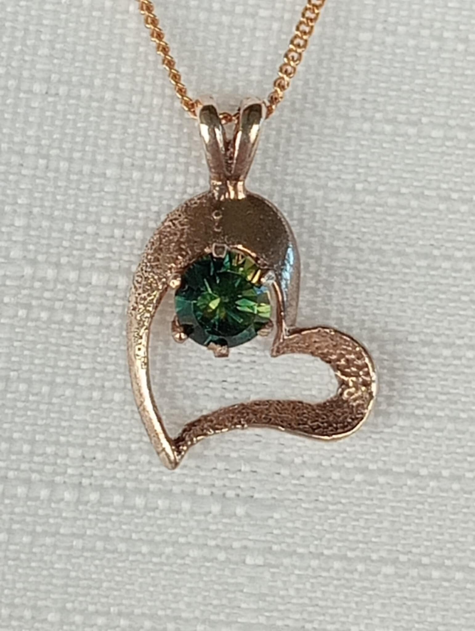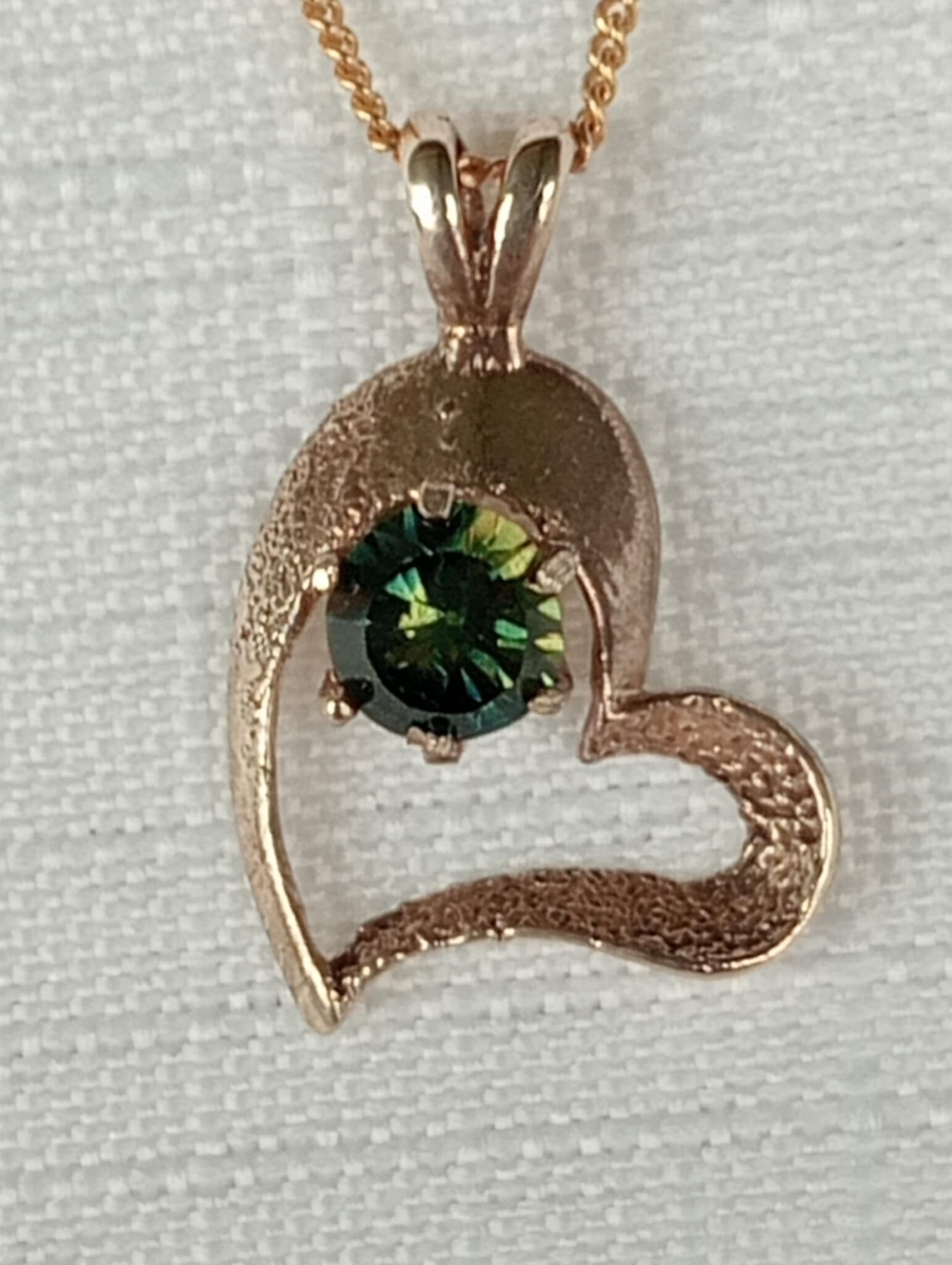 This beautiful green brilliant cut sapphire has been set in 9ct gold handcrafted six claw heart sandcast pendant 10mm wide and 20mm from top of bale to tip.
