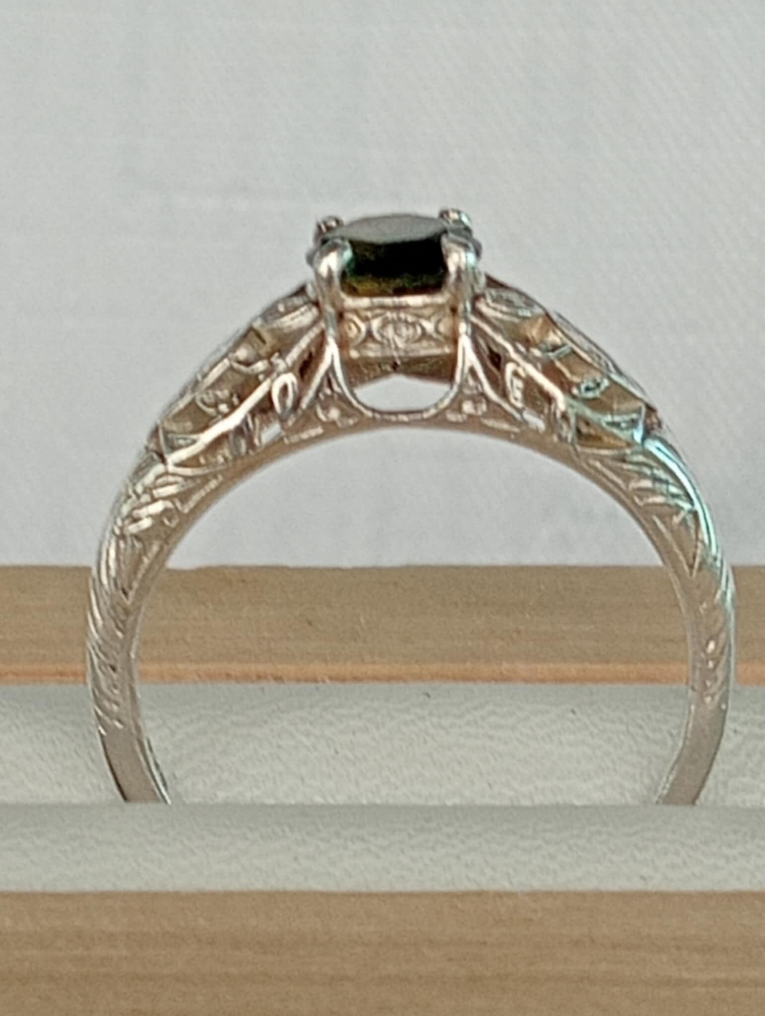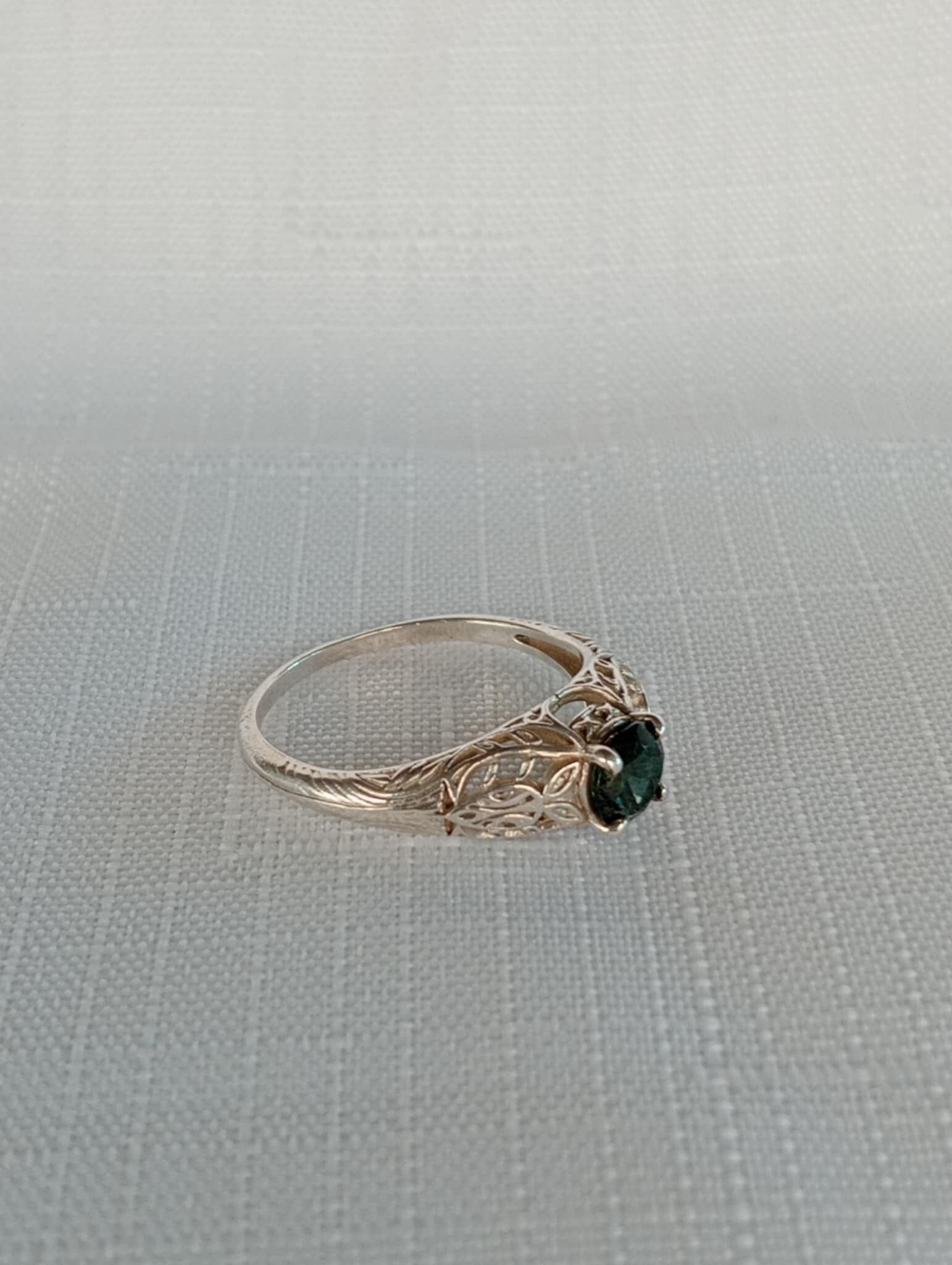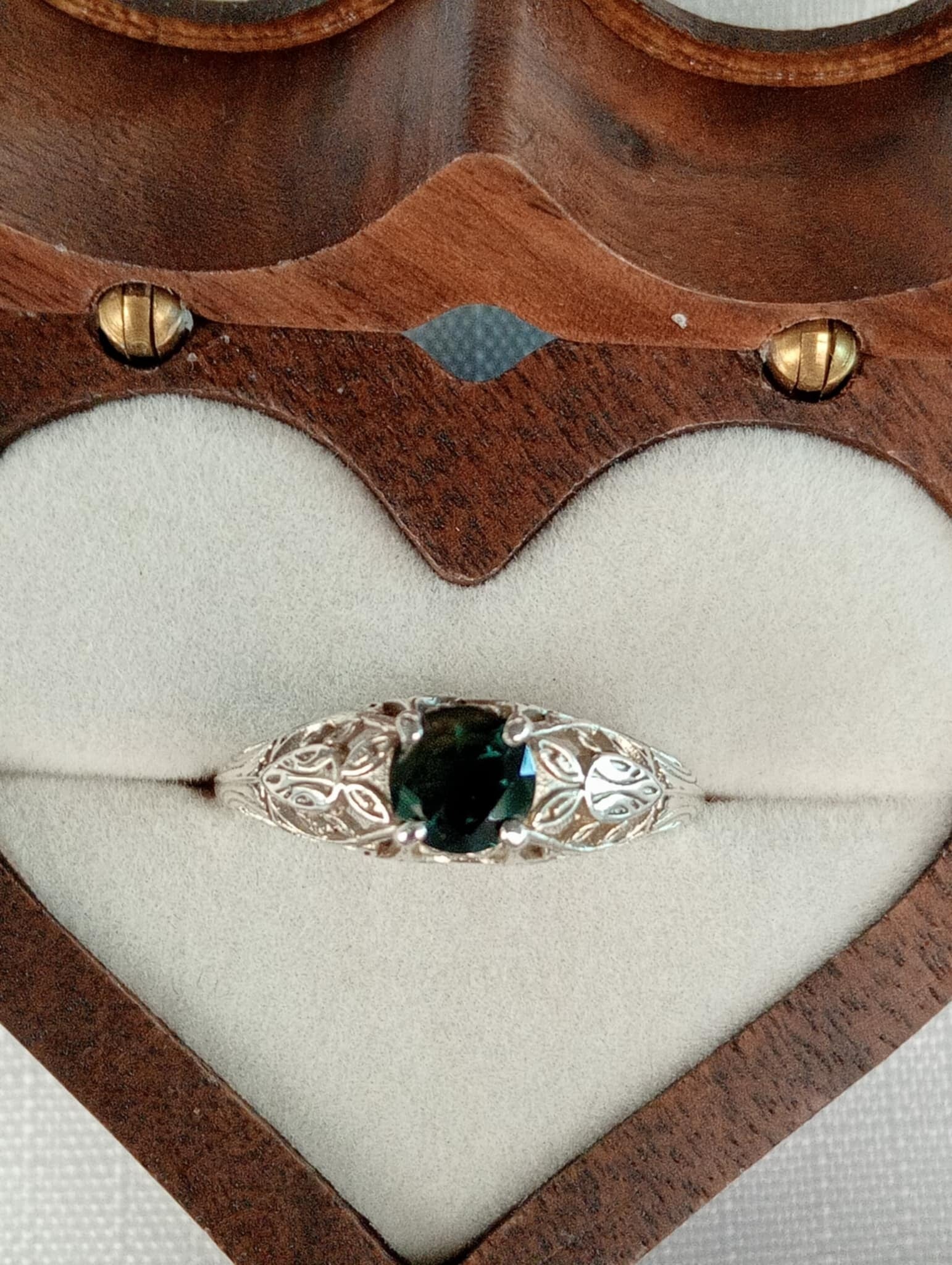 Beautiful Teal/Party CQ Sapphire .90ct 5.8mm set in this Lovely Filigree Setting.