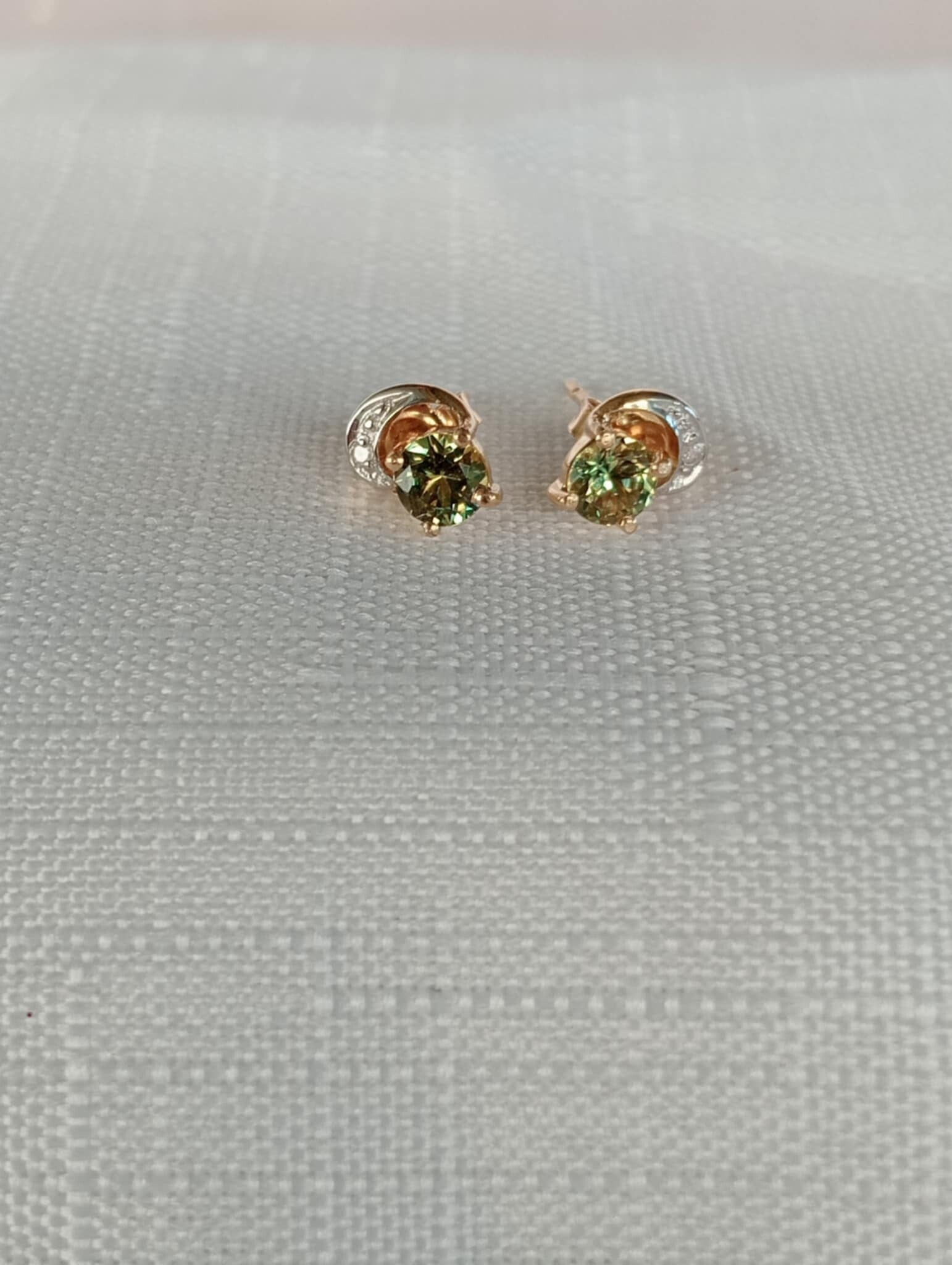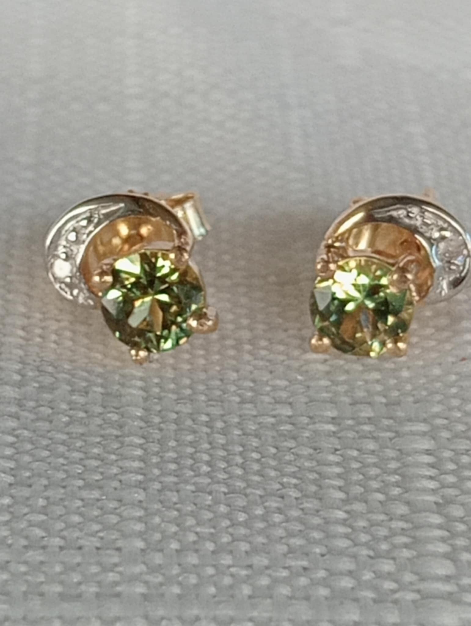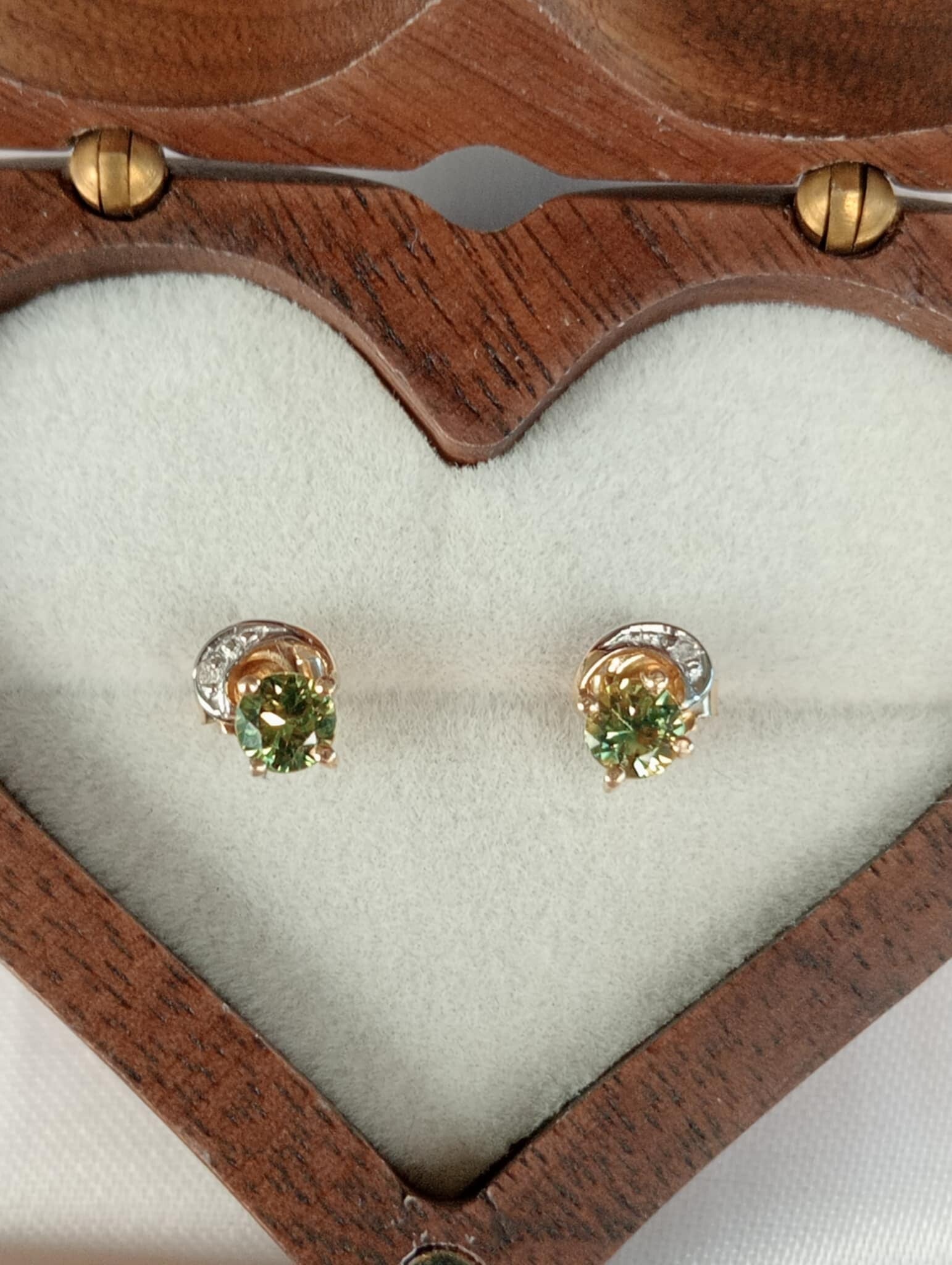 Stunning Diamond set 9ct Gold studs hold this Beautiful pair of .60ct 4mm Green Party Colour Sapphires.