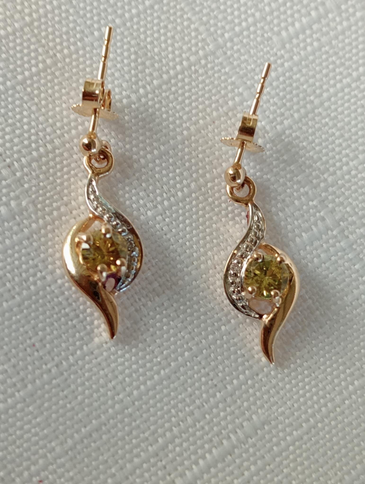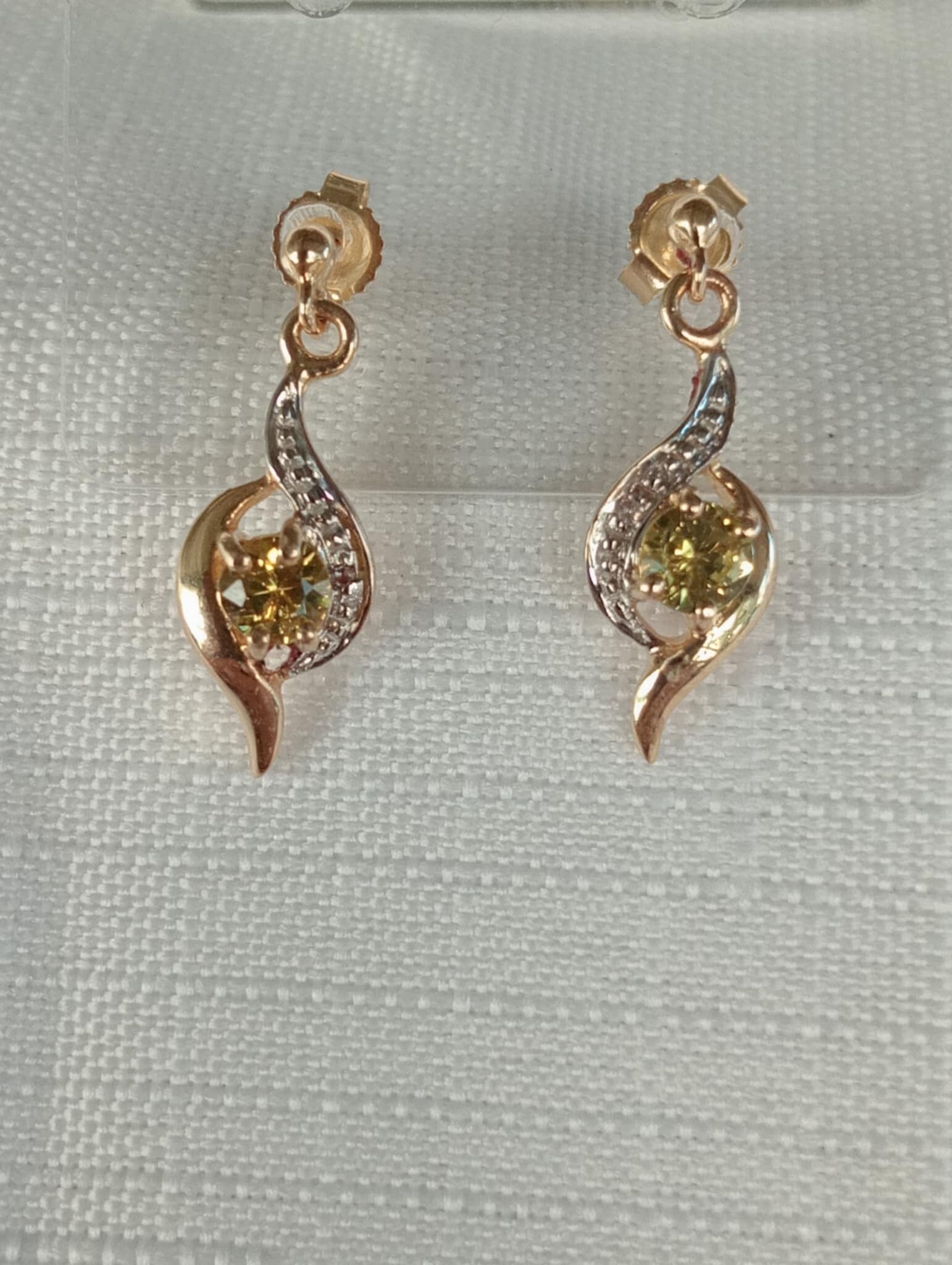 Beautiful Diamond set 9ct Gold Drop Earrings hold an amazing pair of .65ct 4.1mm Yellow Party Sapphires.
